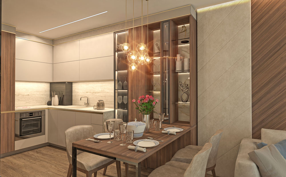 This modern interior balances natural materials with minimalist forms, creating a warm yet refined atmosphere. Subtle lighting and elegant details enhance the sense of comfort and contemporary sophistication.