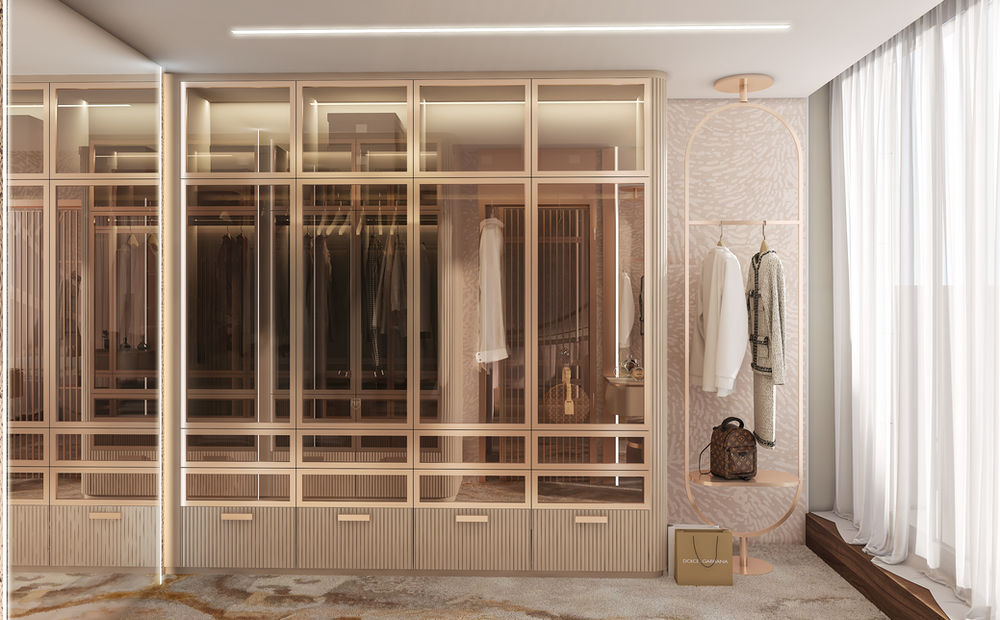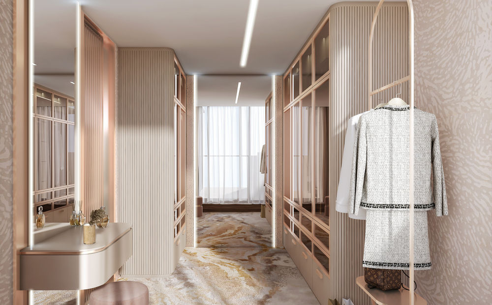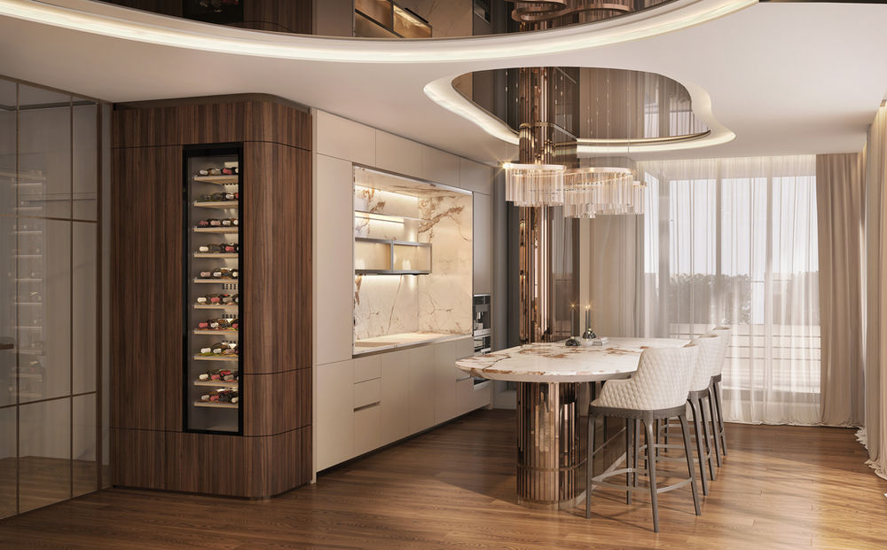 This luxurious penthouse blends contemporary elegance with timeless sophistication, featuring organic shapes, rich textures, and a harmonious neutral palette. The space is designed to offer a refined living experience, highlighted by custom details and curated lighting.