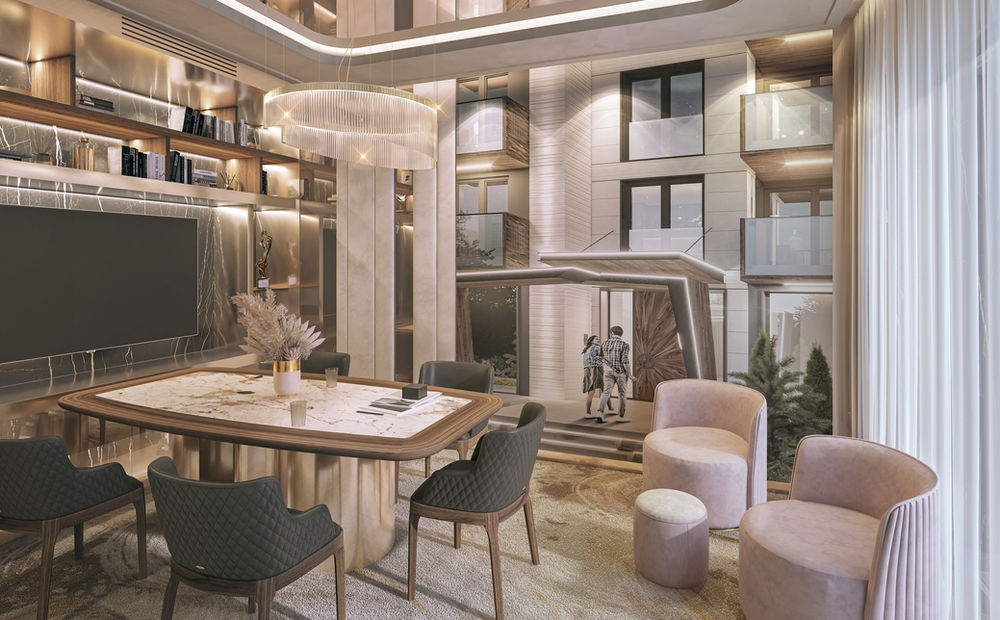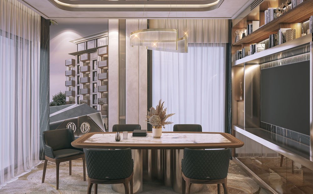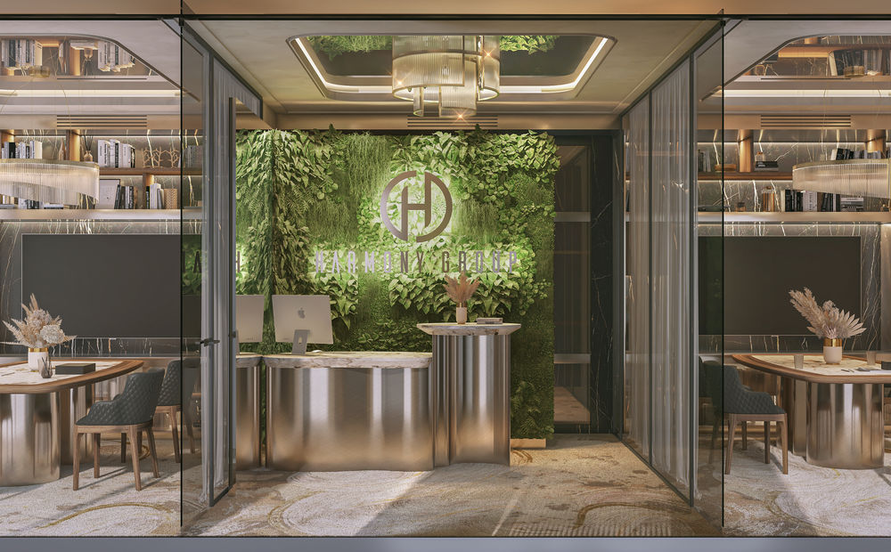 This commercial office interior is designed to reflect the brand’s identity through a balance of modern elegance and natural elements. A living green wall, sculptural lighting, and premium materials create a dynamic and welcoming environment for client interaction.